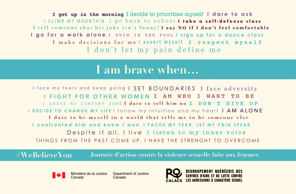 The recent wave of denounciations against sexual violence and harassment in July, brought to light the important issue of sexual violence and the urgency to prioritize the needs of survivors. Although many survivors have shared their stories publicly or privately, it is important to note that most of the publicized testimonials came from people of the white and francophone majority. Thus, resulting in a trivialisation of some experiences and homogenization of others. The challenges that survivors face are plural and multifaceted, yet some are still perceived as less valid. Although this is not the first uprising against sexual assaults and rape culture, the collective mind is still influenced by the perfect victim myth which is rooted in various systems of oppression. These stereotypes tend to erase the experiences of marginalised communities – First Nations, racialized, disabled, LGBTQIA2+, survivors with a precarious migratory status, survivors of incest, etc- creating additional barriers in the search for support, services or justice. The Day of Action on Sexulal Violence agains Women campaign’s goal is to recognize and celebrate the survivors and their journeys, whichever they may be. In order to stay true to their needs and realities, the survivors' journeys have to be filled with bravery that was not chosen, but imposed.